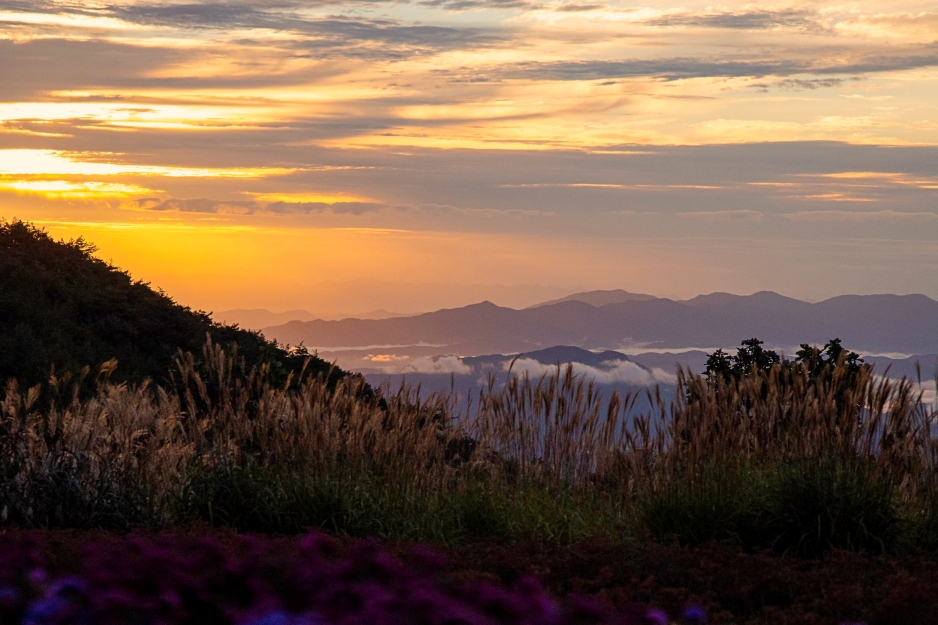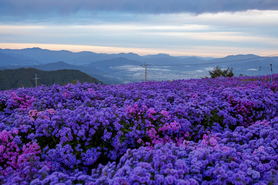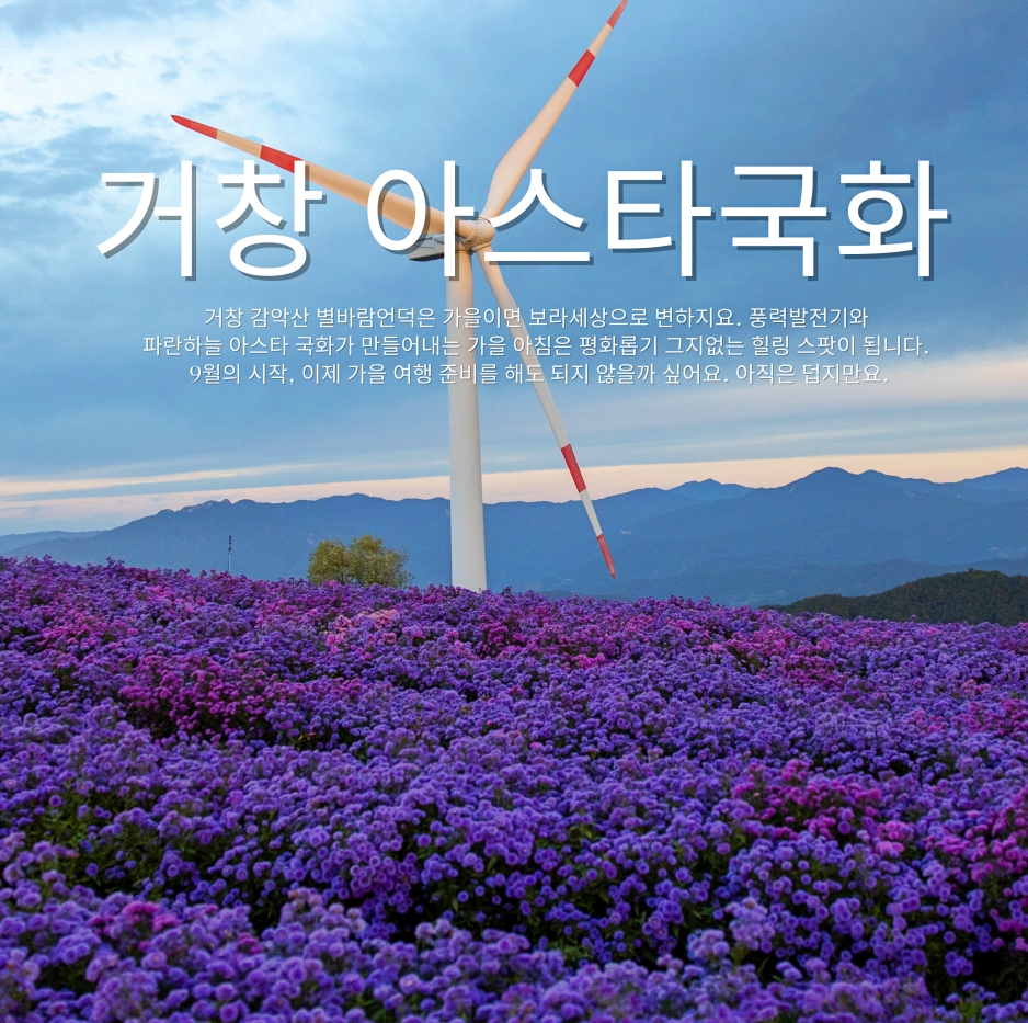 거창 감악산 별바람언덕의 9월은 온통 보랏빛입니다. 아스타 국화가 절정을 이루면서 감악산 정상을 물들이고 있기 때문인데요. 올해는 2025년 9월 19일부터 감악산 꽃별여행 축제가 개최되기 때문에 많은 관광객들이 몰려 혼잡할 수 있으니 이른 아침여행을 추천드립니다. 아름다운 일출과 아스타국화, 구절초, 억새까지 볼 수 있는 곳,