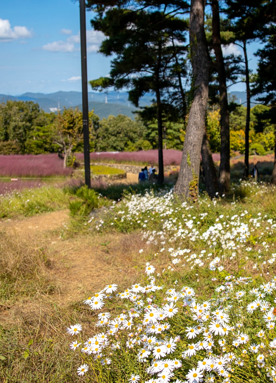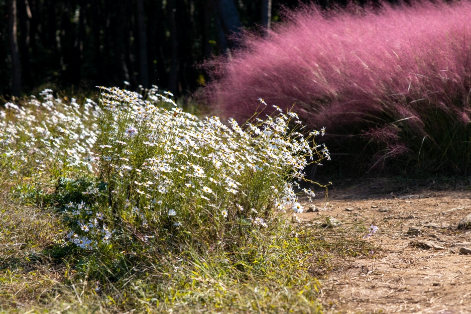 핑크뮬리도 환상적인데 바로 뒤 소나무 숲과 그 주변에는 구절초가 하얗게 피어 분홍 핑크뮬리와 환상적인 조화를 이루면서 아내의 탄성을 자아냅니다. 너무 아름답더라구요!!