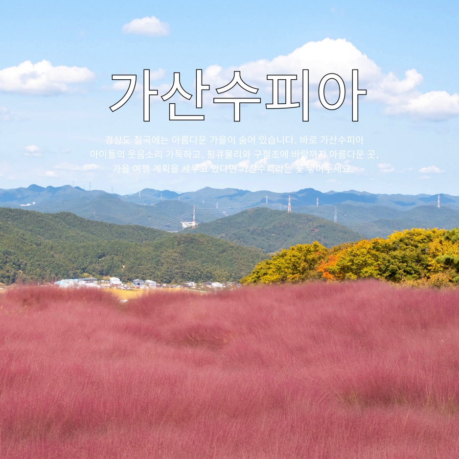 가을에 떠나야하는 칠곡 가산수피아 입장료 무료, 2025.7. 1. 입장료 폐지한 경북 칠곡에 위치한 가산수피아는 사계절 내내 아름다운 자연 풍경으로 많은 이들의 발길을 사로잡는 힐링 여행지입니다. 특히 가을철에는 핑크뮬리, 구절초, 댑싸리, 억새가 어우러져 환상적인 풍경을 자랑하며, 인생 사진을 남기기 좋은 장소로 유명합니다. 블로그에 이용된 사진은 2024. 10월에 촬영된 사진입니다.