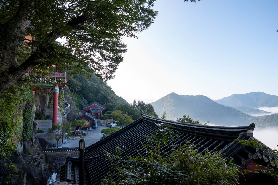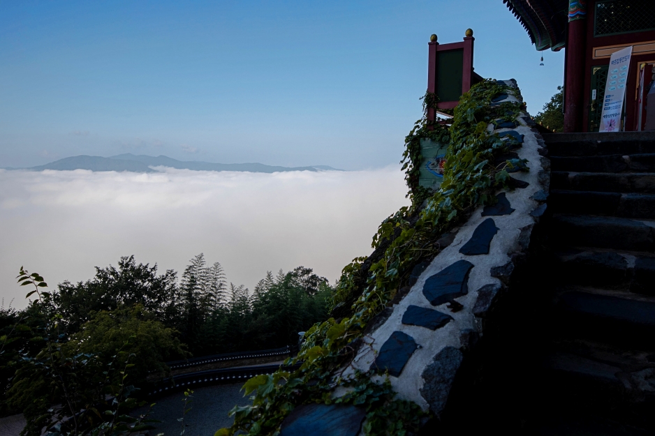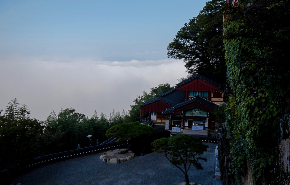 사성암의 상징이라고 할 수 있는 약사전에 오릅니다. 발아래 운해가 가득한 풍경에 압도당하게 되고, 원효대사가 손톱으로 새겼다는 전설이 깃든 약사전 내부 암벽에 그려져 있는 마애여래입상에 다시 감동을 하게 되는 곳,