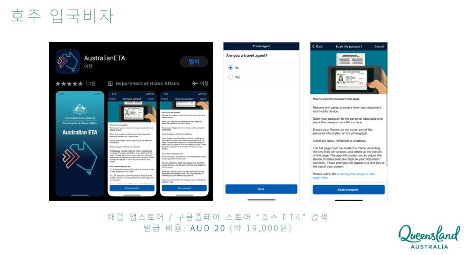 호주는 비자 발금이 기본이어서 모바일 앱 다운로드후 간편하게 전자비자 신청 완료, 금액은 우리돈으로 19,800원 정도~ 호주 달러가 928원 정도여서 1:1로 생각해도 무방하더라구요.