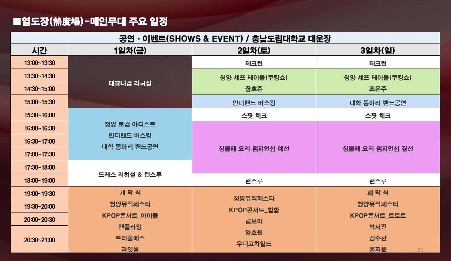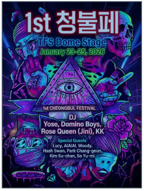 음식만 HOT? NO! 청불페는 라인업도 ‘불타오른다’. 제1회 청불페 – 청양의 청춘은 항상 승리한다. 청불페의 매력은 맛있는 음식에만 있지 않습니다. 이번 축제는 무대 위 라인업부터 관객의 열기까지 모두가 뜨거운 ‘청춘 종합 페스티벌’입니다. 올겨울 즐겨야 할 대표 페스티벌이라는 것이지요.