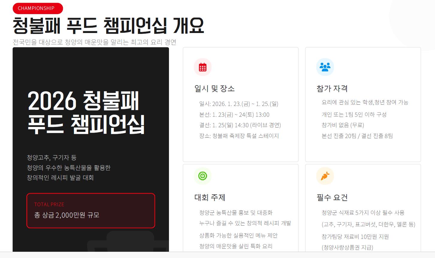 겨울을 녹이는 HOT한 만남 제1회 HOT 청양 FOOD 페스타 ‘청불페’ 알프스 얼음축제로 겨울의 중심으로 유명한 충남 청양에서 청춘의 열기와 지역의 맛이 어우러진 특별한 축제가 열립니다. 바로 충남도립대학교 주최하고 청양 지역과 함께 만드는 제1회 청불페(청춘불패 페스티벌)입니다. “청양의 청춘은 항상 승리한다” 이번 청불페의 캐치프레이즈는 단순한 문구를 넘어 청양의 젊음·도전·지역의 미래에 대한 응원을 담고 있습니다. 대학의 청춘과 지역의 열정이 만나 추운 겨울마저 뜨겁게 달굴 제 1회 청불페,